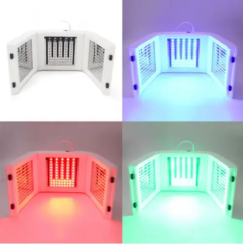 La Cabina LED con 7 colores de terapia de fotones trabaja diferentes longitudes de onda para tratar múltiples problemas de la piel. Su diseño flexible y adaptable permite utilizarla en rostro, cuello, brazos, abdomen y piernas, brindando una experiencia completa tanto facial como corporal.
